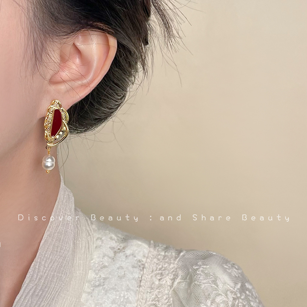 Retro wine red oil drop earrings niche light luxury pearl earrings with silver needles