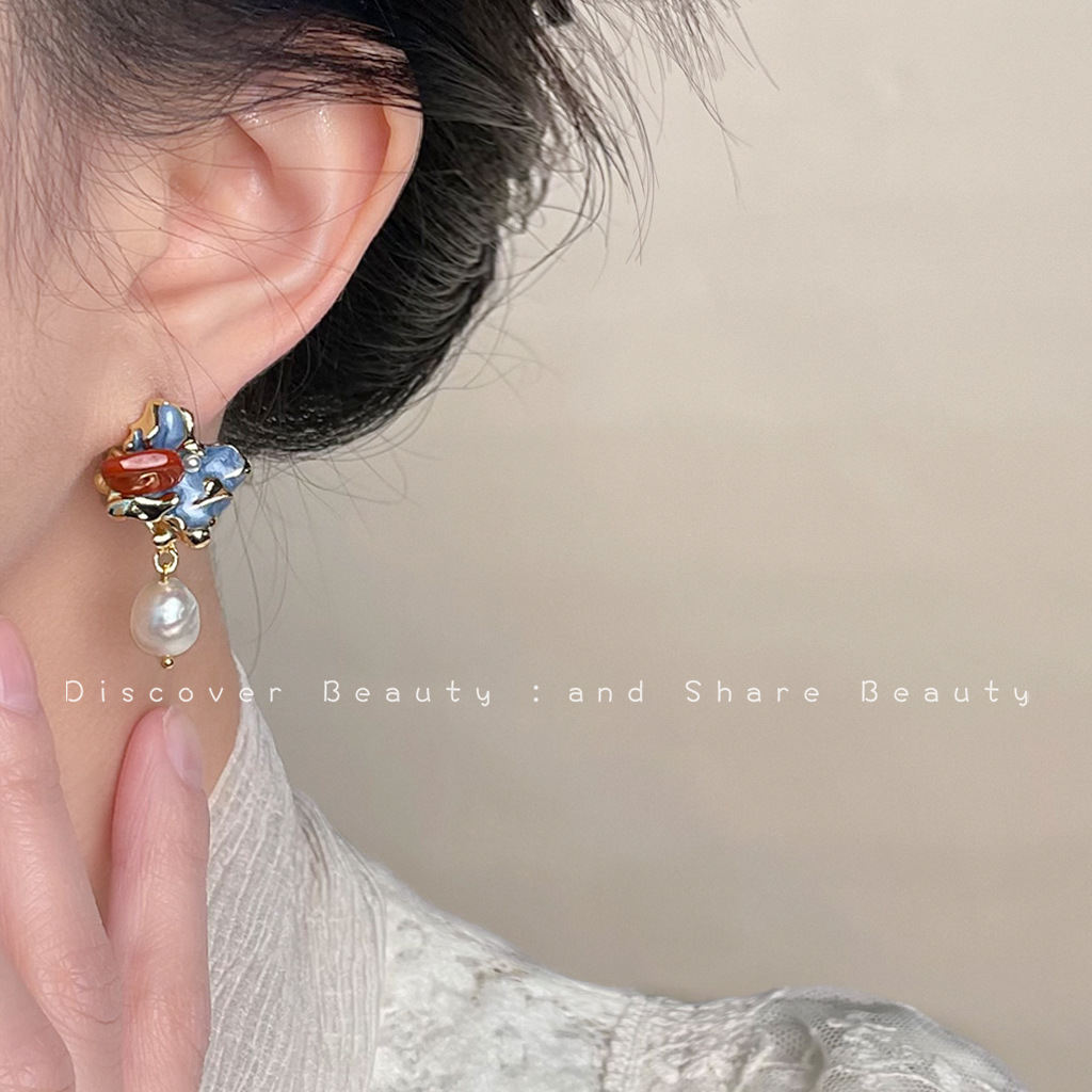 Retro wine red oil drop earrings niche light luxury pearl earrings with silver needles