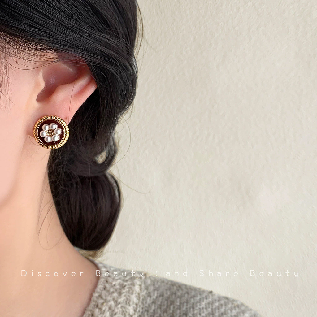 Retro wine red oil drop earrings niche light luxury pearl earrings with silver needles