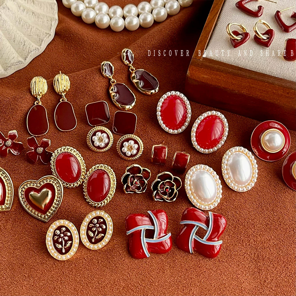 Retro wine red oil drop earrings niche light luxury pearl earrings with silver needles